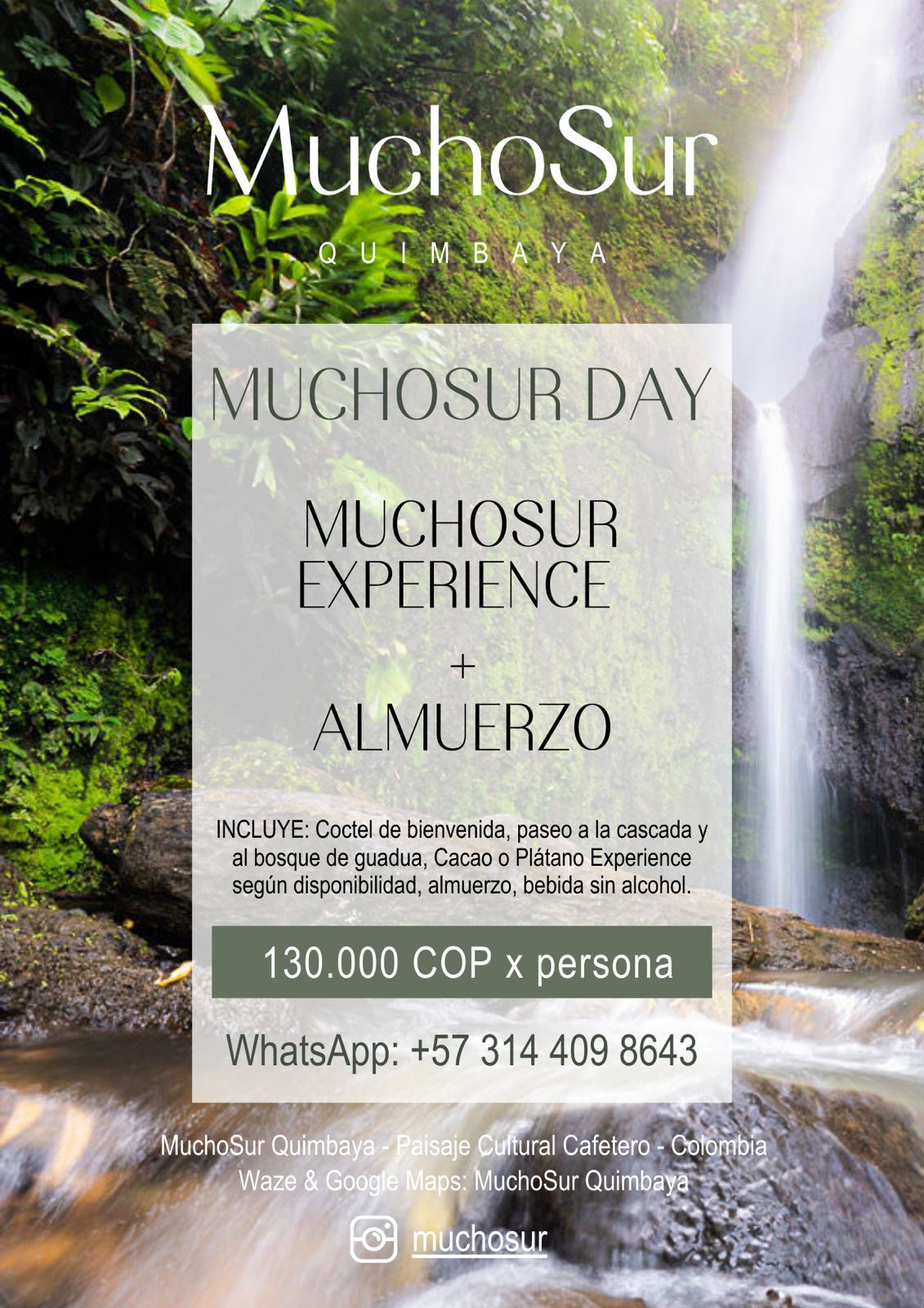 INCLUYE: Coctel de bienvenida, paseo a la cascada y al bosque de guadua, Cacao o Plátano Experience según disponibilidad, almuerzo del Sur, bebida sin alcohol.